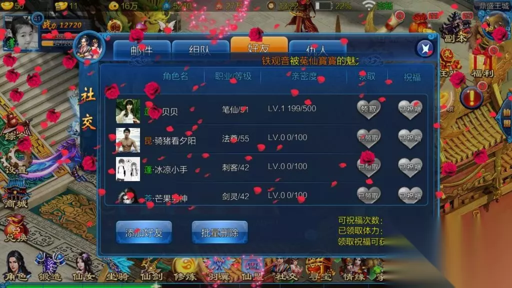 交友系统也是非常丰富,好友之间可以互送鲜花,大送鲜花时,游戏界面更是有满屏的鲜花飘落,十分的美丽,祝福好友有可以得体力,各项好友的互动,更是可增加亲密度,要是是男性的话,也就可以凑合着嫁了~ ③.交易系统