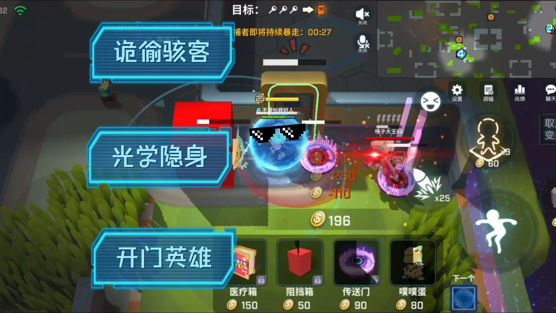 这是《逃跑吧!少年》的游戏对局内容,玩家使用角色骇客在银金速刷局中,通过变身道具隐蔽自己,配合队友完成开锁,最终开启逃生门,展示了骇客在速刷局的玩法技巧。