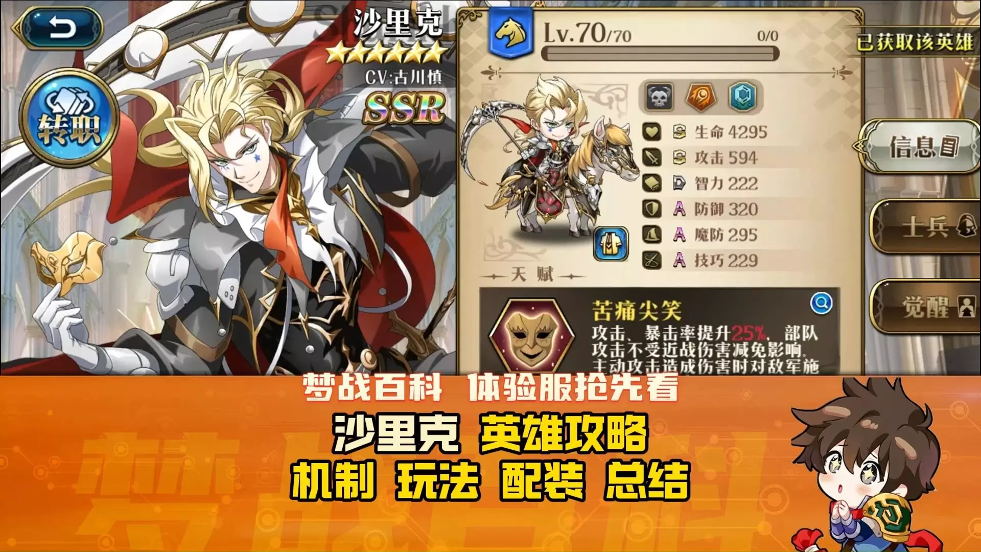 这是《梦幻模拟战》体验服的英雄测评内容,对SSR英雄塔布莉丝,也就是黑天马、暗天马,进行了讲解、实测和总结,展示了该英雄的属性、天赋以及逆光栖影、重光之拂晓等技能效果。