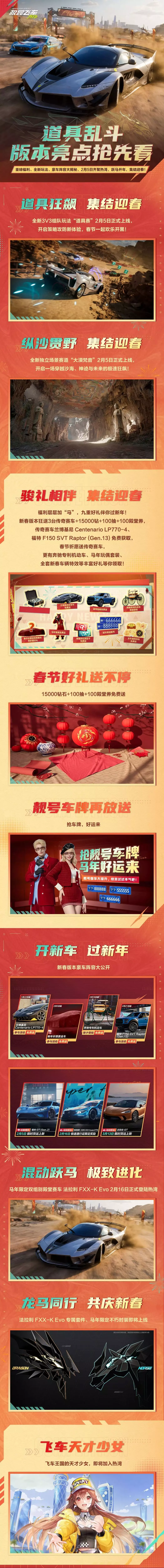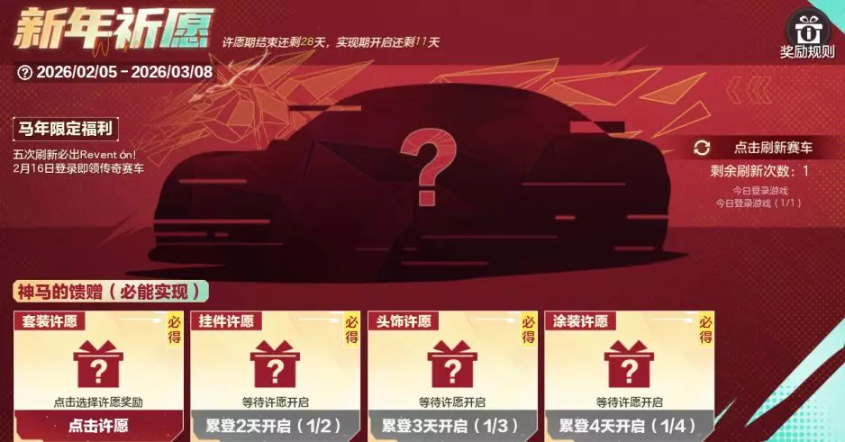 2月5日-3月8日活动期间,赛车手完成每日任务即可获取奖励刷新次数,刷新必定开出传奇赛车奖励,每次刷新后可自由选择保留当前奖励或替换,刷到心仪奖励时直接锁定准备收入囊中;同时参与活动完成4天登录任务,就能解锁专属许愿单并许下你的马年心愿!除夕过后心愿惊喜正式揭晓,心仪的传奇赛车、涂装、套装、头饰、挂件好礼通通抱走~
