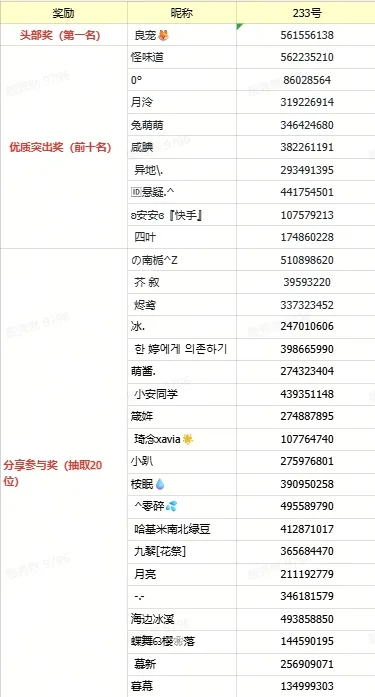 恭喜以下玩家获奖!获奖名单公示期3天,若有异议请在公示期间提出,奖励将在7个工作日之内陆续发放!