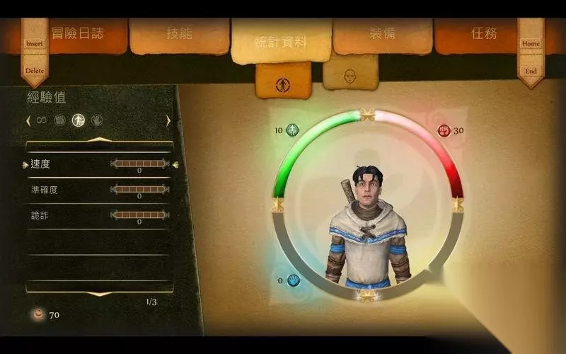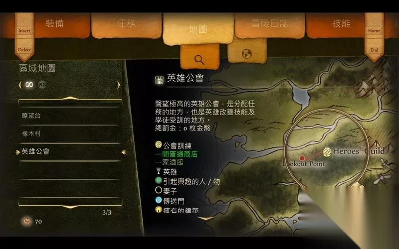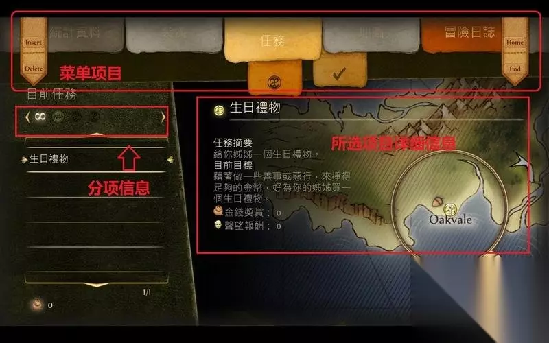 菜单界面 按F键可以打开菜单界面。 这里会罗列出任务、装备、地图、日志及魔法信息。 详细信息在标签下方显示,可以通过Home|End键选择大项目。 Insert|Delete键选择分项。个项目说明清晰,简单易懂。