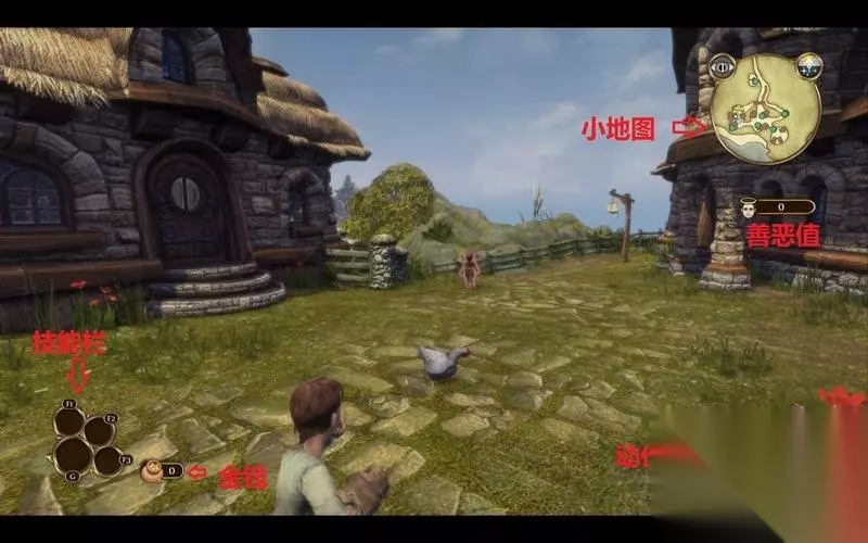 主界面 主界面右下角为动作栏,选定目标后可以利用动作栏进行互动、攻击等可选动作。 右上角为小地图,NPC和敌人会以绿色和红色的圆点显示。 左下方为技能栏,可以施放的魔法会在这里显示。 右侧中部善恶值则会影响到剧情的选择和NPC的交互难度。