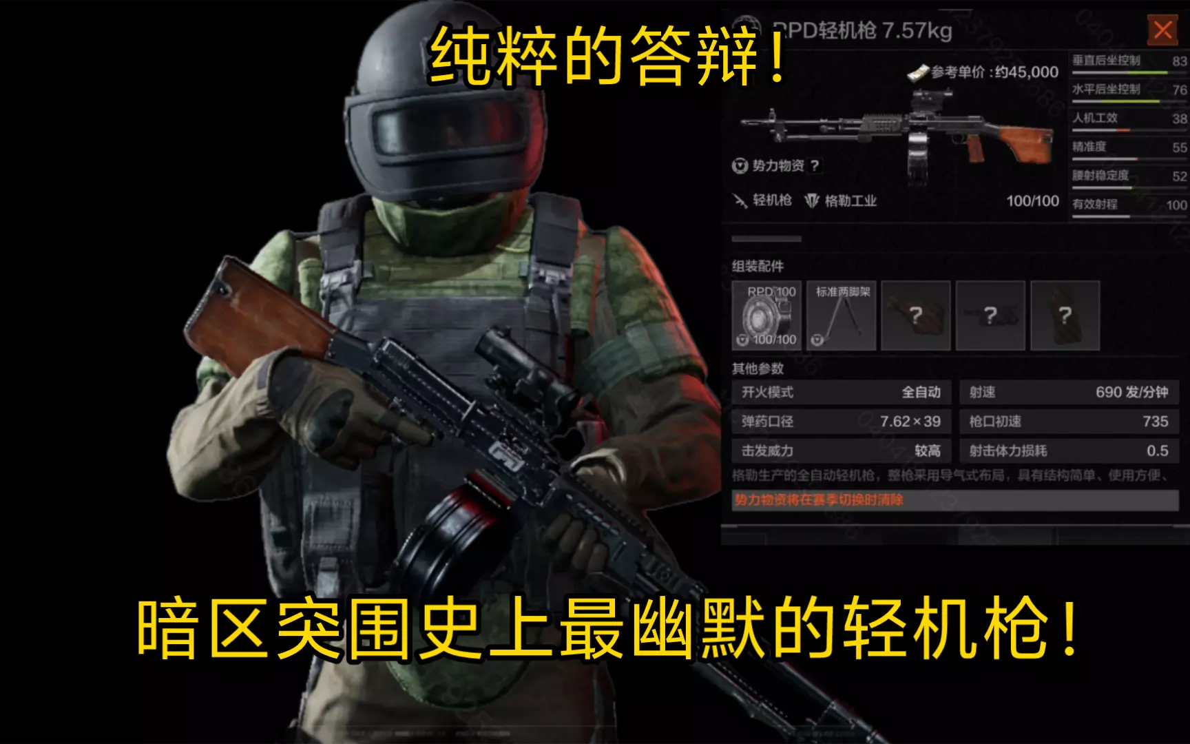 这是一篇《逃离塔科夫》的枪械盘点内容,介绍了游戏里存在感最低的枪械,展示了RPD轻机枪、AK-105突击步枪等枪械,提及了它们的口径、射速等属性,以及这类枪械在游戏里受冷落的现状。