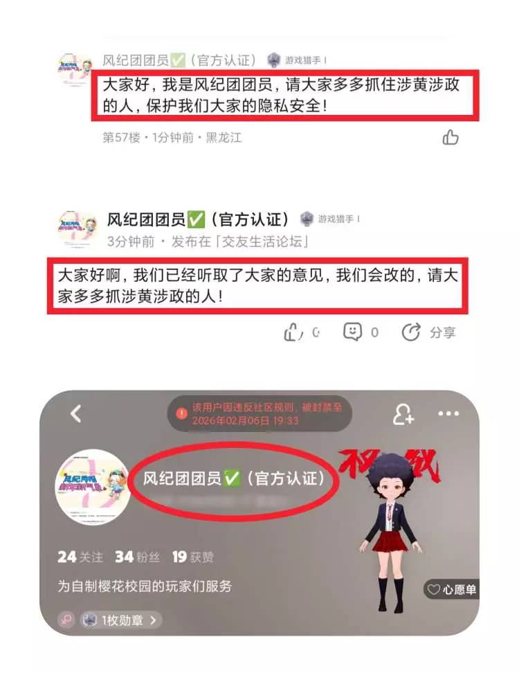 最近,我在社区里发现了有人冒充风纪员并发布相关言论试图引起玩家的注意!现已对该账号进行了封禁作为处罚,并且屏蔽了相关言论,后续也会对该昵称和头像进行重置~风纪员是维护社区氛围的重要一环,是为大家做贡献滴,所以不要试图冒充风纪员噢!如果想要加入风纪团,可以留意后续风纪团的招募哦!(如果大家在社区内看到有类似冒充风纪员、官方人员的用户,可以第一时间私信风纪员或版主进行举报👌🏻)