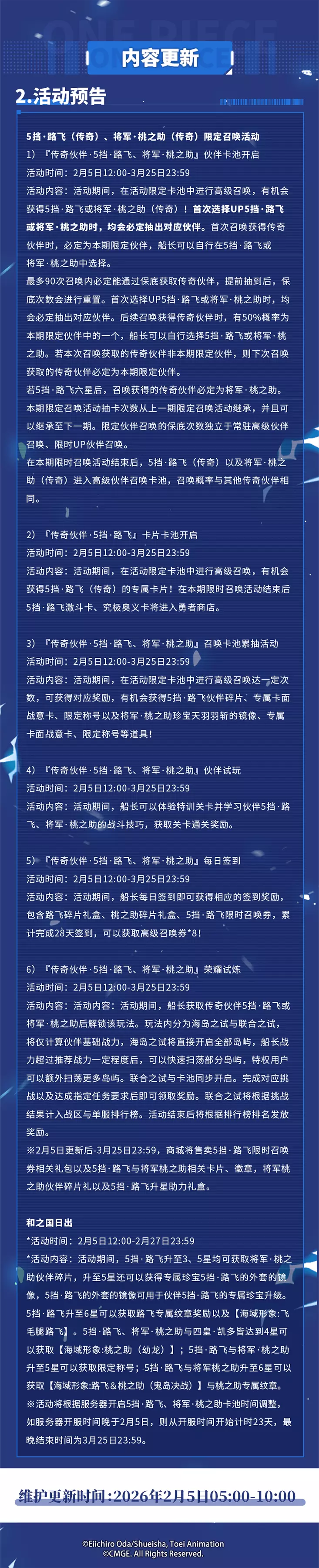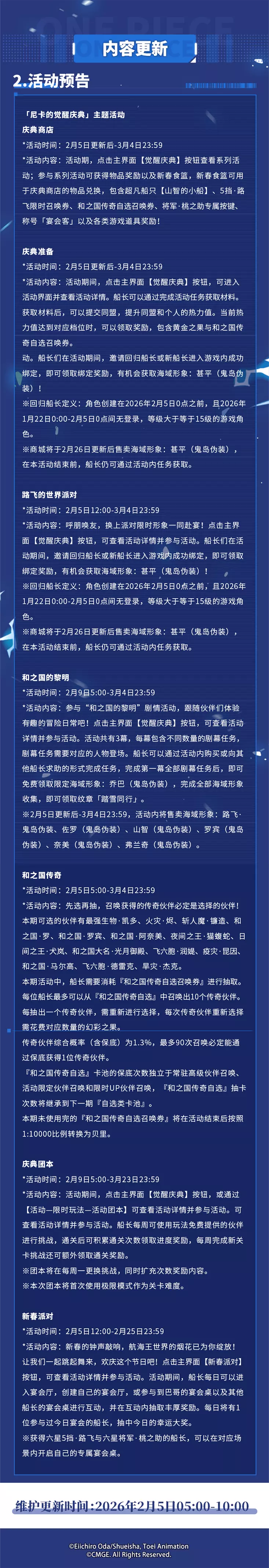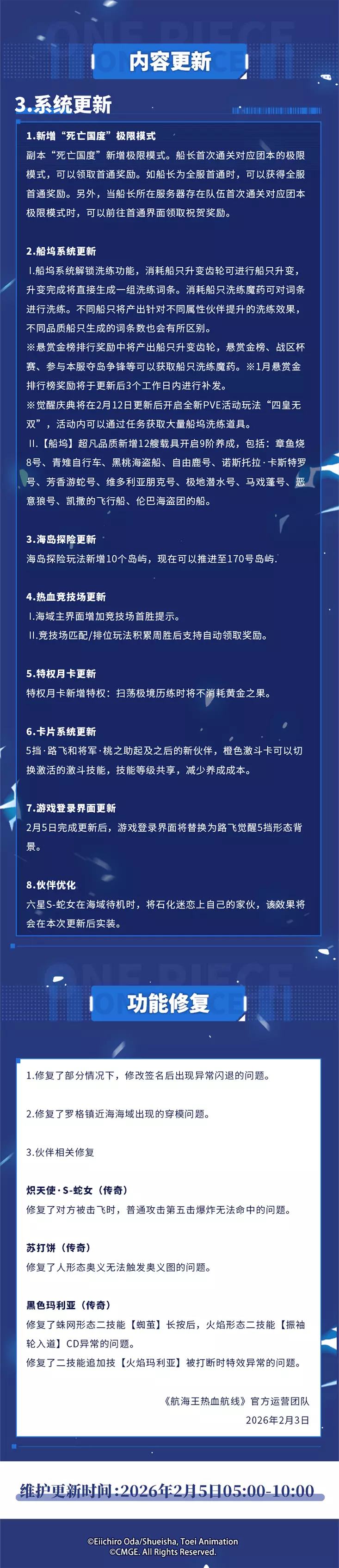 为了各位船长旅途更丰富、航行更平稳,《航海王热血航线》将于2026年2月5日5:00-10:00进行维护更新,预计停服维护5小时(可能根据实际情况提前或延后),届时将无法登录游戏,请大家互相转告并提前下线,避免不必要的损失。维护前已创建的角色将可获得停服补偿:黄金之果200、卡片召唤券*1 ,请各位船长留意查收邮件,感谢大家的支持与配合。