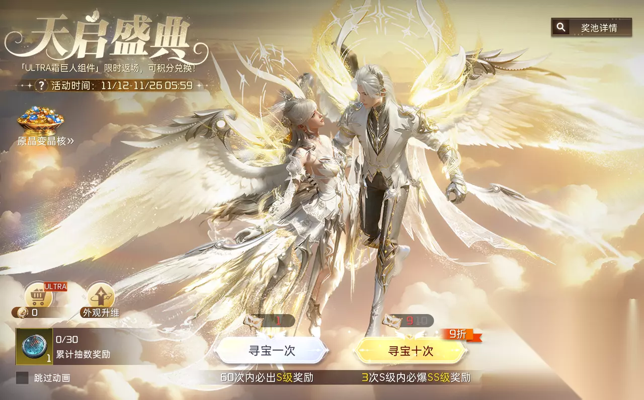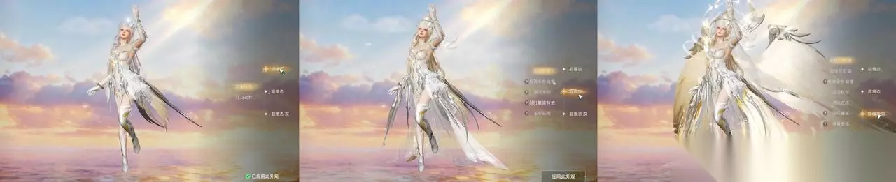 五、天启盛典:颜值战力双丰收 这次福利加码,惊喜不断!全新双形态多维「双生天启」时装来袭,男女款各展惊艳质感,升维到超维态可获「奢vs简」双形态,让你的外观更加炫酷! 女款以流光白金羽翼为设计核心,裙身融合轻纱与金属质感,柔美的渐变白纱随步伐漾起银河波纹,羽翼展开时星点流光簌簌落下,肩颈处的晶钻镶嵌与科技纹路交织,既显天界女神的圣洁梦幻,又自带未来感冷冽锋芒,每一寸剪裁都衬出灵动娇贵。