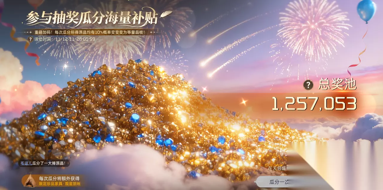 七、瓜分百万补贴:天启盛典抽奖瓜分海量补贴 百万补贴暴击来袭,参与天启盛典抽奖直接瓜分海量原晶,更有10%概率触发欧气暴击——原晶秒变等量晶核,血赚一波!关键是每次瓜分都能额外抱走限定珍品家具「观星旅帐」,颜值质感双在线,摆进庄园直接拉满氛围感!这波福利简直是天上掉馅饼,赶紧来试试手气呀~
