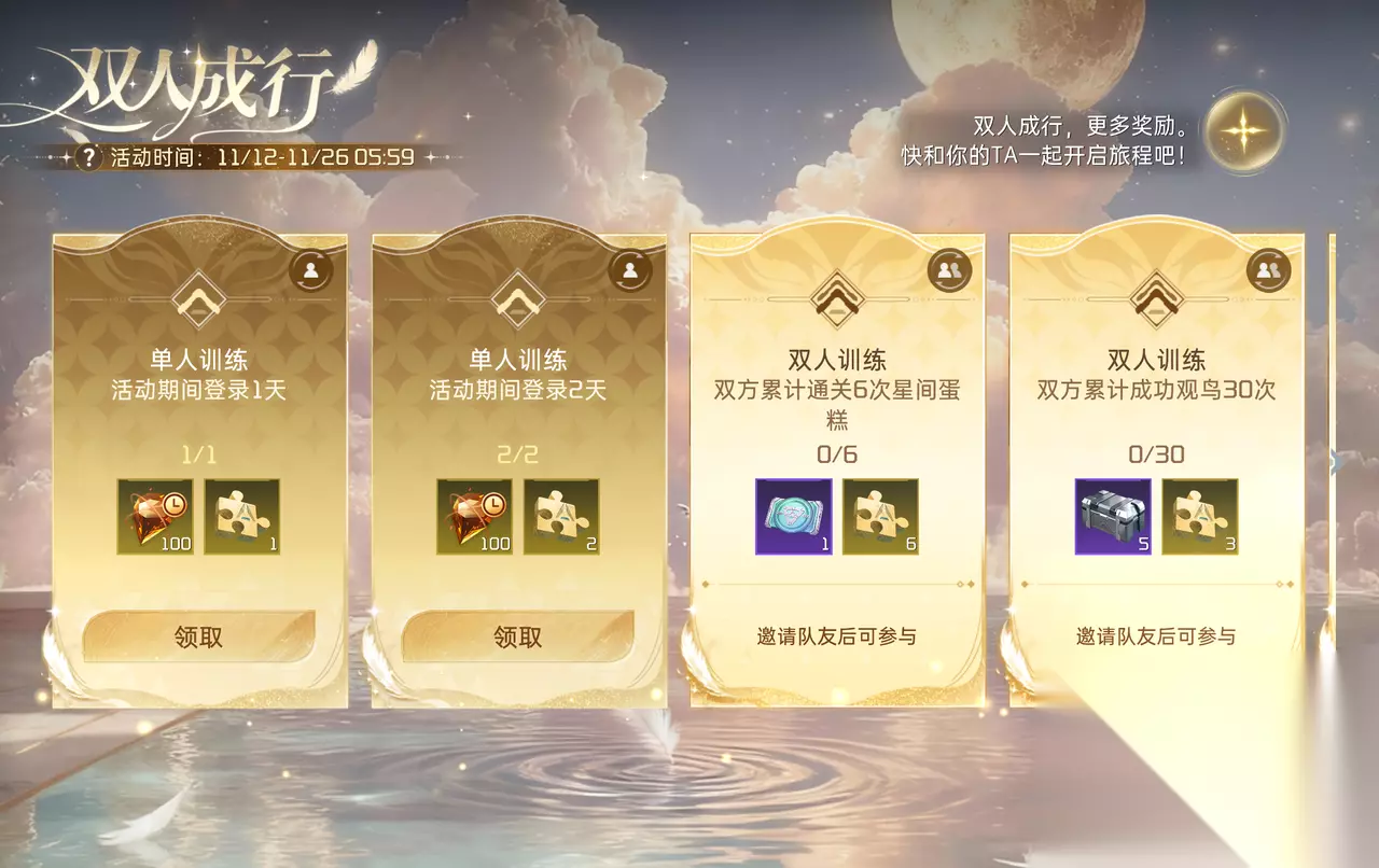 三、双人成行:组队快乐奖励翻倍 二周年就要好事成双,快拉上你的游戏搭子一起冲!单人登录领限时晶核和拼图碎片,双人组队通关星间蛋糕、观鸟、送礼物、钓鱼等双人训练,珍稀道具拿到手软! 完成任务卡额外拼图碎片,解锁拼图可领对应奖励,全部解锁还能抱走SSR宠物盲盒!组队冒险的快乐加倍,奖励也加倍,和你的TA一起开启旅程吧!