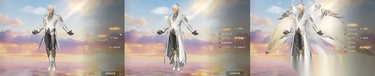 男款同样以白金羽翼为视觉焦点,利落的银白长衣搭配暗纹黑衬,线条冷硬的科技装甲与羽翼的柔和羽毛形成碰撞,行走间衣摆与羽翼的垂坠感自带飒爽气场,细节处的金属镶边与流光特效交织,既有天界战神的尊贵威严,又透著未来科技的冷峻高级感。