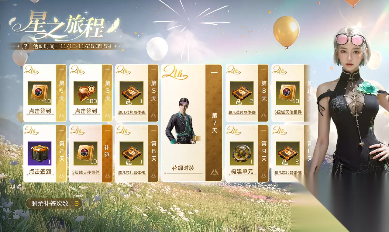 二、星之旅途:签到奖励升级 每天登录即领限时晶核、S级域天使组件等,累计签到7天,周年限定「花绸」时装免费抱走!累计签到14天,还有武器皮肤免费拿!就算不小心忘签也不怕,补签3次帮你兜底,所有奖励一个都跑不掉啦!