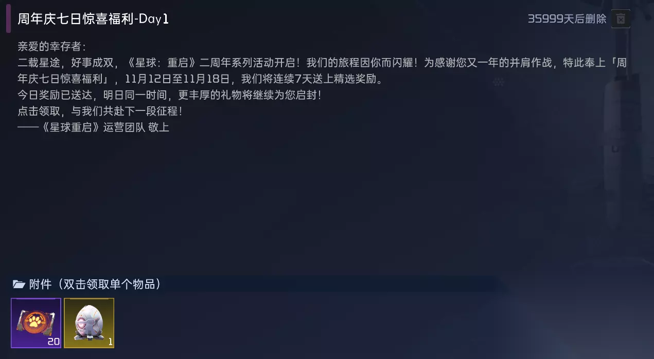 幸存者们早上中午晚上好! 《星球:重启》二周年 “星球庆典” 正式开启! 阿姨依旧准备了一篇福利汇总,耐心看完,让你福利拿到手软!