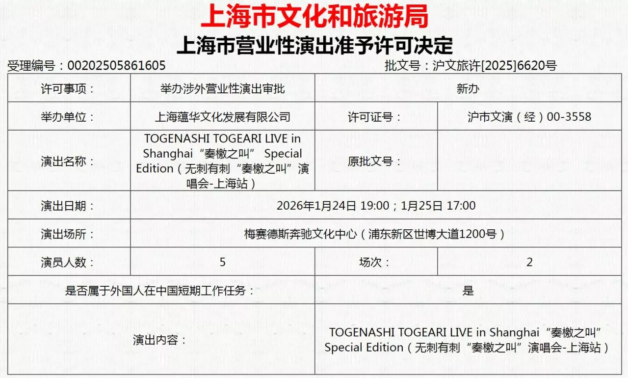 名称:TOGENASHI TOGEARI LIVE in Shanghai "奏檄之叫”Special Edition (无刺有刺“奏檄之叫”演唱会-上海站)演出日期:2026年1月24日19:00;1月25日17:00场次:2场地:梅赛德斯奔驰文化中心(浦东新区世博大道1200号)