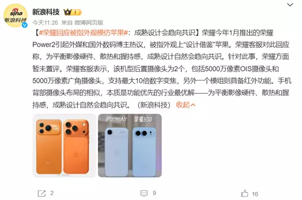 近日,荣耀今年1月推出的荣耀Power2引起外媒和国外数码博主热议,被指外观上设计借鉴苹果——这款手机实际只有两颗后置摄像头,但为了看起来“更像苹果”,却设计了三颗摄像头,其中一颗为红外模组。据国内媒体报道,荣耀客服对此回应称,为平衡影像硬件、散热和握持感,成熟设计自然会趋向共识。