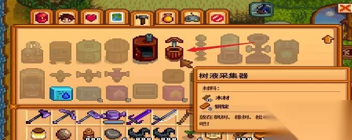 星露谷物语枫糖浆获得方法 1、在背包面板点击建造按钮。 2、用铜锭和木材制作树液采集器。