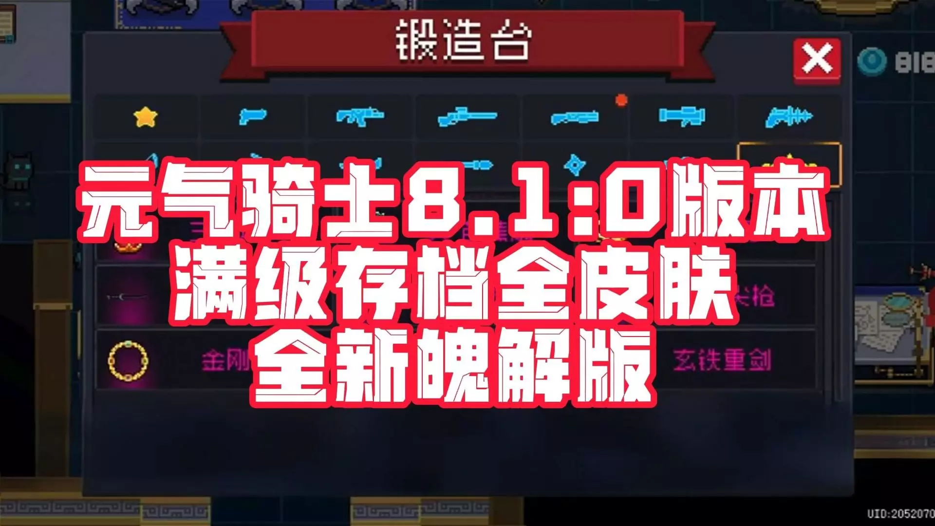 这是一则手游情报,带来了元气骑士8.1.0版本的公益存档,该存档为满级存档,拥有全皮肤,还展示了多个满星角色的技能等内容。