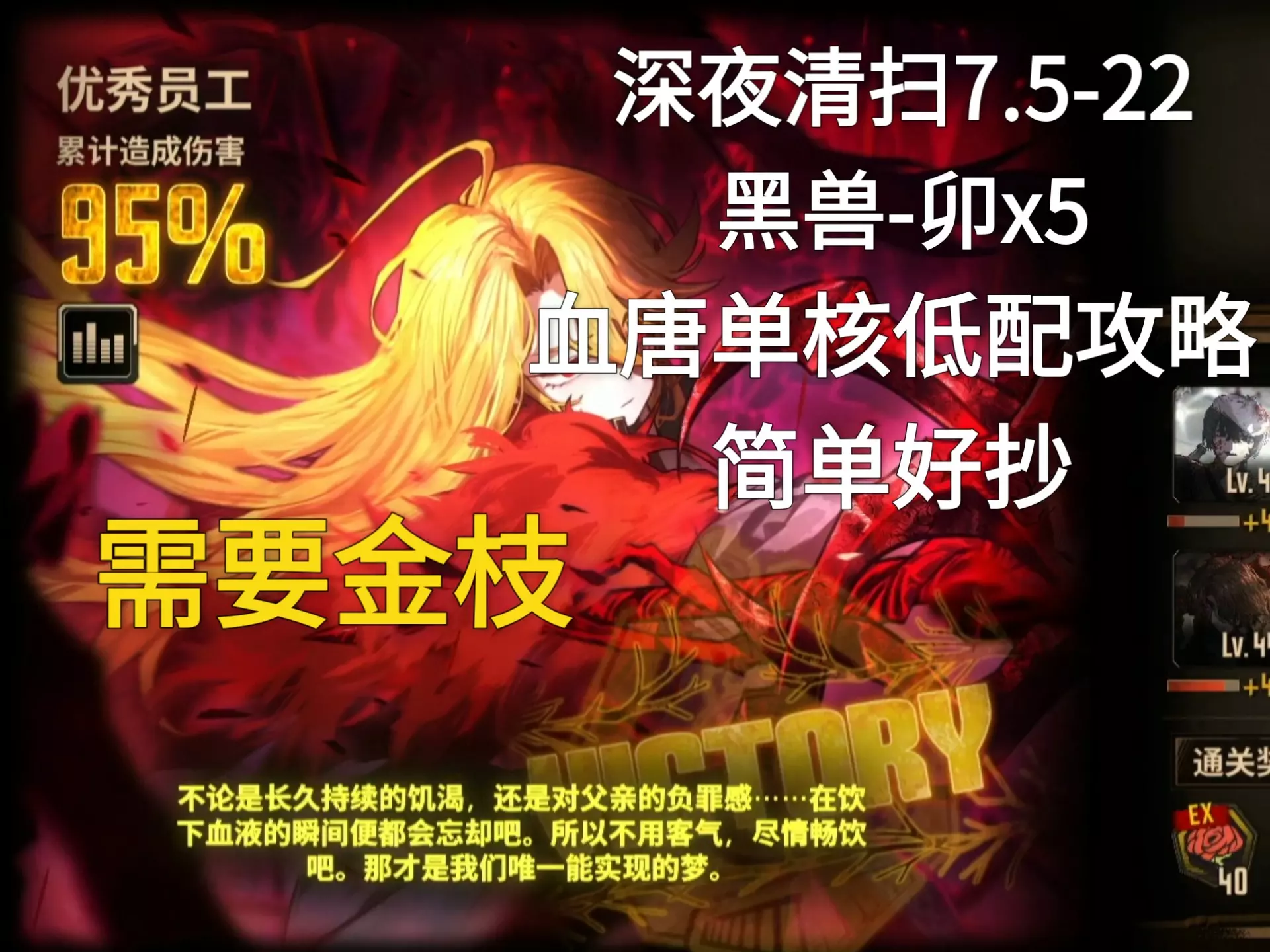 这是玩家自制的游戏《深夜清扫》7.5-22关卡低配攻略,采用血唐+蜜卡拉单核阵容,需搭配金枝,操作简单易上手,适合没怎么练人格、打不过该关卡的玩家,玩家亲测有效,也欢迎其他玩家分享思路。