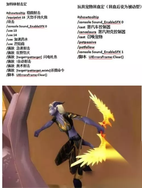 最后再发几个经过优化的自动射击宏,可以根据自己的需求来替换武器,加入了奥射没加多重,让你的队友感受一下魔兽怀旧服兽王加特林的威力吧。配合之前那个蒸汽坦克玩具给宝宝回血的宏,现在的猎人真就TBC唯一指定DPS,除了费钱基本没有缺点了。