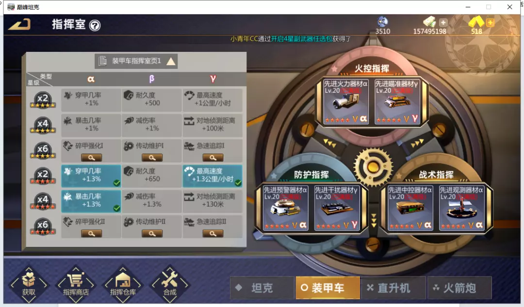 随后把目光放在指挥室上。无尽中建议用6个红五星α器材,增加暴击,增加碎甲。上面两个管火控的器材(先进火力器材和先进瞄准器材)的词条要尽可能地刷“机炮额外伤害倍率”。新出的指挥室继承让8个红色“机炮额外伤害倍率”成为了现实,总计大概32%的“机炮额外伤害倍率”。