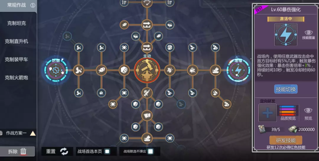 右侧“增幅”技能槽要选“暴伤强化”,毕竟无尽是一直在暴击的,在蓝鲸配合下那更是凸显出暴击伤害倍率的重要性;中央主动技能槽肯定是要用“战役风暴”的,它那高额的无视装甲强度倍率和超长持续时间让它成为了不二之选。莫怕技能等级低,等级再低它也比别的技能效果好。此处再提一嘴,该技能和“竞技回护”一样,都需要使用定项研发书才能研发出来,该定向研发书可以在首领密藏商店里面买。