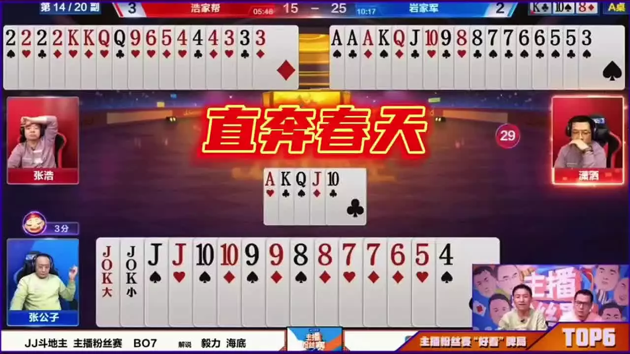 这是JJ斗地主冠军杯的精彩对局,呈现了四炸对决的TOP2牌局,牌局中选手们的出牌策略尽显JJ斗地主技巧,俩农民的牌型让对10对J管不上,老将出马顶K启动顺子,对局十分精彩。