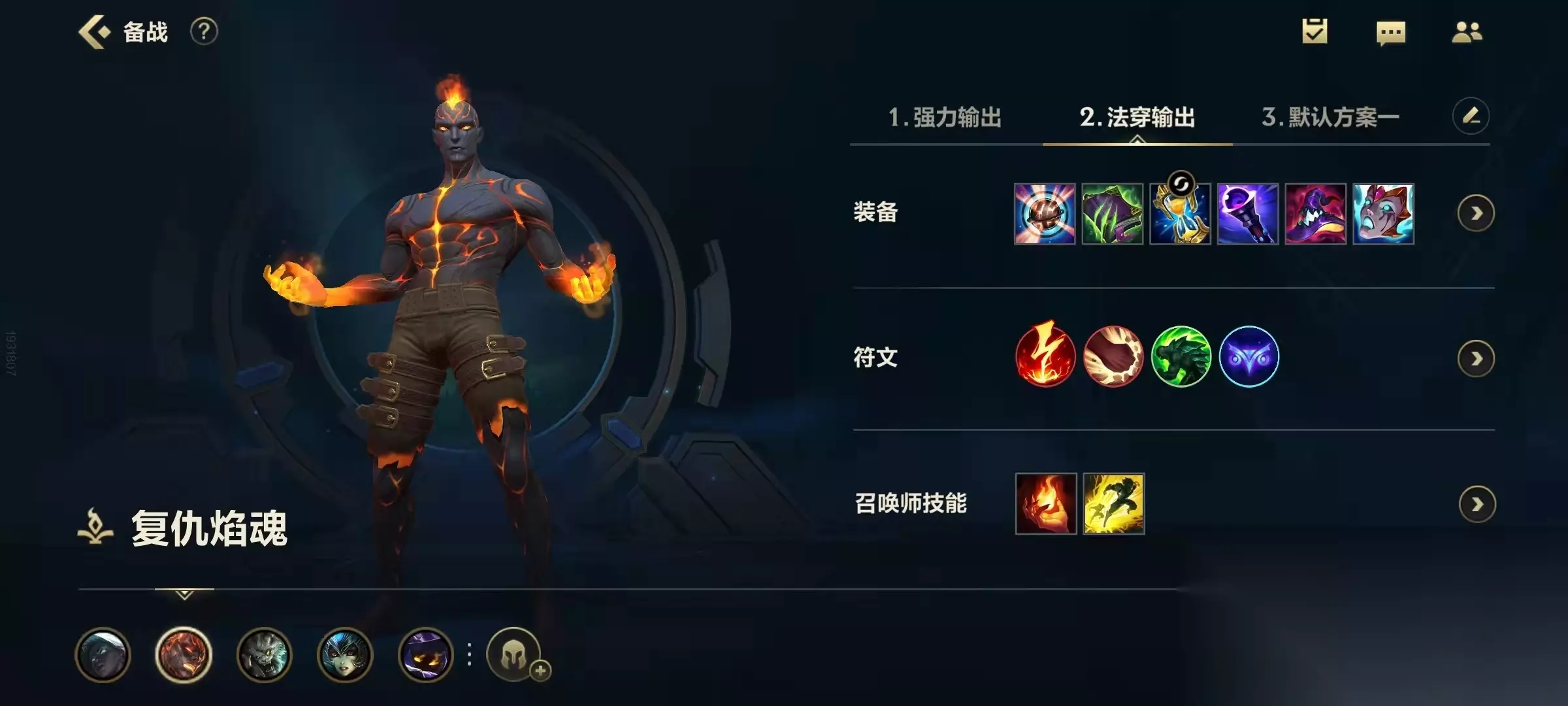 三、装备推荐 火男:无限宝珠、鬼书、金身、法穿棒、帽子、面具 赛娜:魔宗、排眼刀、鸟盾、幽梦、黑切、重伤弓 火男的核心装备是大面具,大面具契合火男的被动,可以在技能命中目标后,灼烧敌人百分比的生命值。其余装备把伤害拉满,提升火男的爆发和灼烧伤害,鞋子拿CD鞋,附魔金身保命。赛娜则是常规的辅助装。魔宗提供法力值和CD,穿甲装备提升输出,重伤弓限制对手的回血,排眼刀可以限制对手的视野。
