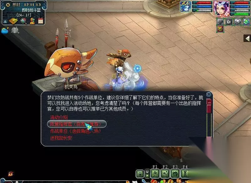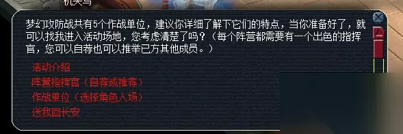 报名成功的话就会出现系统消息,12:10分发放资格以及红蓝阵营名单。收到这个你就可以屁颠屁颠进场了。 3、进去之后,有两个要点:第一,左上角显示你是哪个阵营的,得记住哈;第二,点那个机关鸟,然后自荐指挥官。