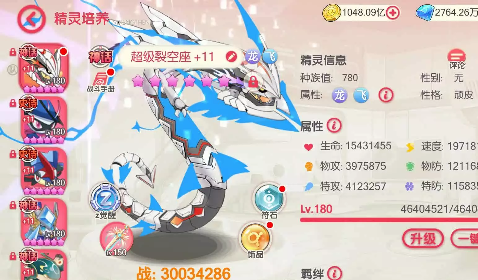 这是RPG手游《口袋觉醒》的玩家账号展示,该玩家已签到近2000天,在区服排名第一,主玩v2龙队,拥有超级裂空座等高战力精灵,总战力超1500万,精灵收藏率达86.9%。