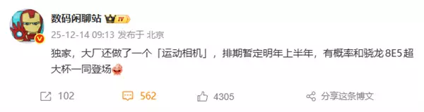 快科技2月4日消息,据界面新闻报道,vivo今日确认,已于2025年底在内部立项一款Vlog相机产品。该产品将对标大疆Osmo Pocket系列,预计2026年发布,目前尚未公布正式命名。另据鲸犀报道,这款Vlog相机将重点面向Vlogger及摄影爱好者等内容创作者人群,主打更稳定、更易上手的手持拍摄体验,直接切入目前由大疆、影石Insta360等品牌主导的便携影像设备市场。此前,数码博主“数码闲聊站”曾爆料称,某大厂做了一个运动相机,发布时间排期暂定2026年上半年,并有望与第五代骁龙8至尊版超大杯机型一同登场。