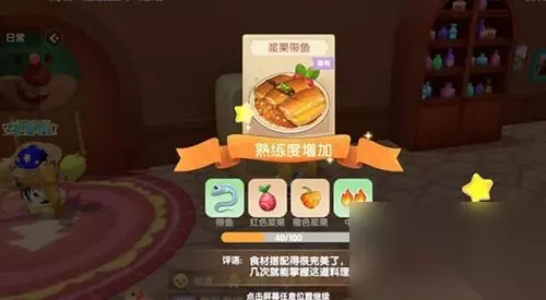 食谱配方 带鱼+红色浆果+橙色浆果 火候 中火 解锁方法 厨师等级达到12级解锁 食材获取 带鱼:带鱼可以通过钓鱼的方式来获得; 红色浆果:前往浆果丛林然后可以在地上捡到一些红色浆果; 橙色浆果:找到路边的灌木丛或者浆果丛林,使用采集技能可以采集到。