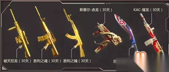 礼包奖励:破天狂龙(30天)、胜利之魂(30天)、胜利之魄(30天)、斯泰尔-赤龙(30天)、尼泊尔军刀-9周年(30天)、KAC-耀龙(30天) 2、回归游戏有礼 玩家进行一次游戏后可立即领取战斗八件套(单Q限领取一次)