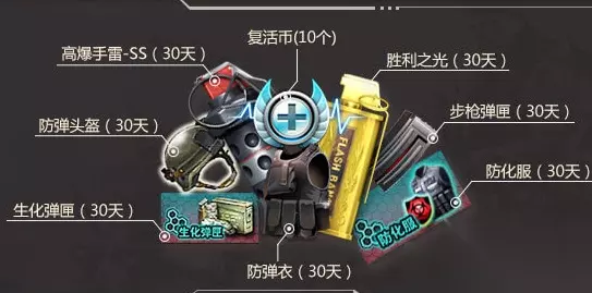 战斗八件套:高爆手雷-SS(30天)、防弹头盔(30天)、胜利之光(30天)、防化服(30天)、防弹头盔(30天)、生化弹夹(30天)、步枪弹夹(30天)、复活币10个 3、胜利礼包 老兵回归后,每日加入任意游戏一局,累计3天,即可立即领取胜利大礼包(单Q限领取一次)