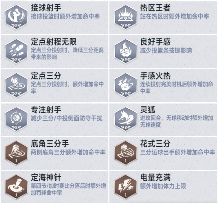 他的三分投射(107)稳定而快速的投篮包,搭配大量的三分徽章,让他能在接球后迅速出手,是无球端绝不可放空的威胁。