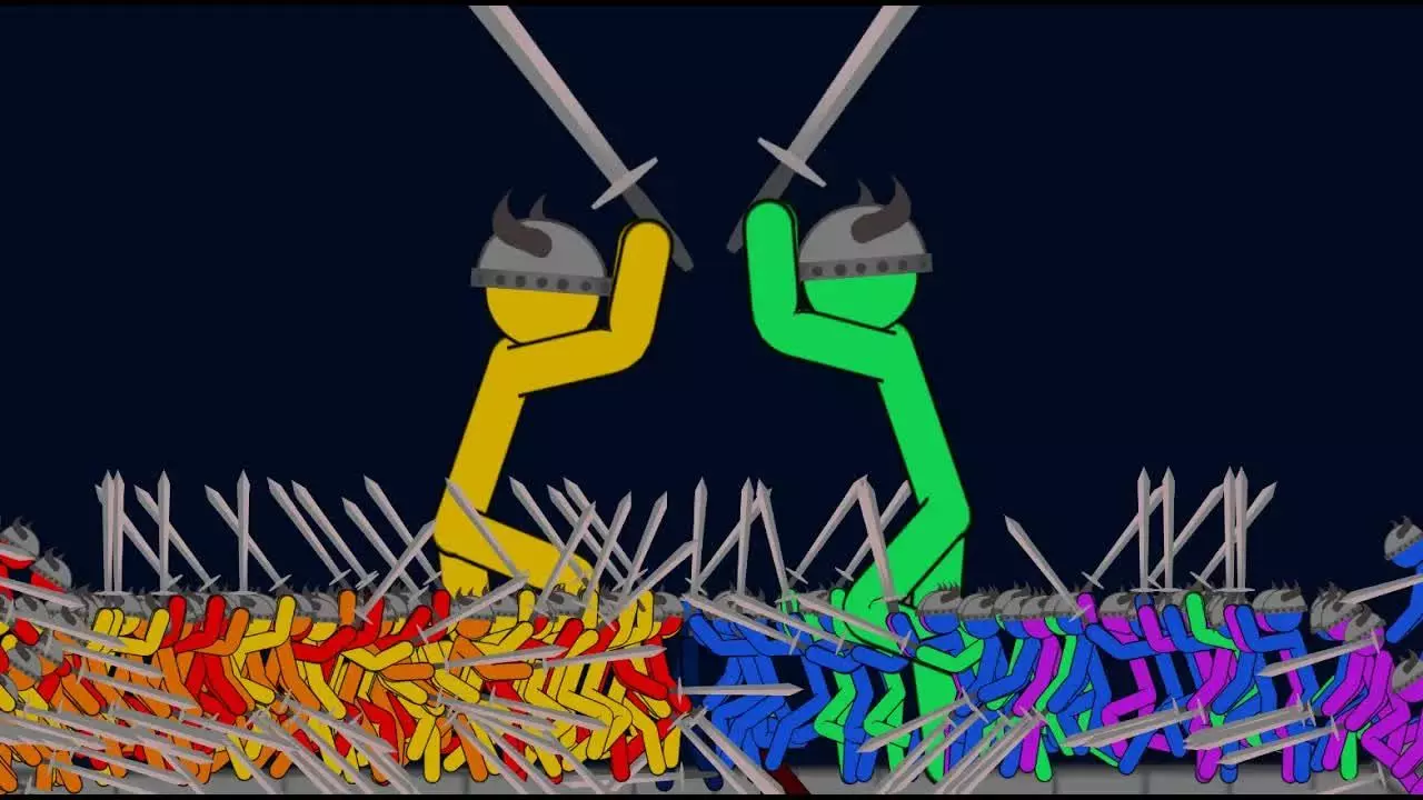 这是《火柴人3V3桥战[2]》的游戏内容,展示了多支不同颜色的火柴人队伍在桥面上展开对战的场景,不同队伍的火柴人持械交锋,画面上方还有对应队伍的数值面板,呈现出火柴人桥战的激烈对战过程。