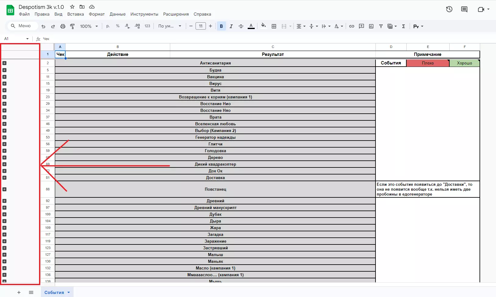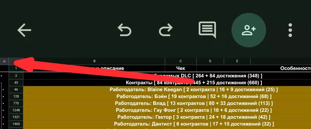 本节将帮助您快速移动表格并使用揭示表格全部潜力的所有功能。 PC上的表 快捷键Ctrl+F或F3或Ctrl+HCtrl+F和F3是搜索键,它们不仅适用于表格,也适用于任何页面的任何浏览器。在表格中,它们只查找您看到的数据——它们忽略隐藏的单元格或其他工作表上的数据。 Ctrl+H是用于搜索和/或替换文本/公式的键。如果您需要在不同的工作表上或同一工作表上但在隐藏单元格中查找一些数据-您可以使用此shell中的搜索,它将显示找到所需值的单元格。 可单击的导航元素复选框复选框(空方块)是单击它们时会更改的值。 只有两项规定: 空方块-“False”(0)的值,即复选框处于非活动状态 带刻度的正方形——“真相”(1)的值,也就是说,复选框是活动的,并确认适用于它的东西的存在。 通过“加号”扩展行/列在整个表格中,您可以看到左侧和顶部的加号图标——这些是可以通过单击打开和隐藏的行或列组。 需要它们来隐藏潜在的必要信息,直到需求的那一刻。 如果您看到一些行/列在您看来似乎未完成或缺少一些必要的数据-很可能它们被隐藏了。 通过单元格编号/列名扩展行/列如果隐藏单元格太多-单击左侧块上的PCM(鼠标右键)→展开所有行组/折叠所有行组。下图中此块的位置: