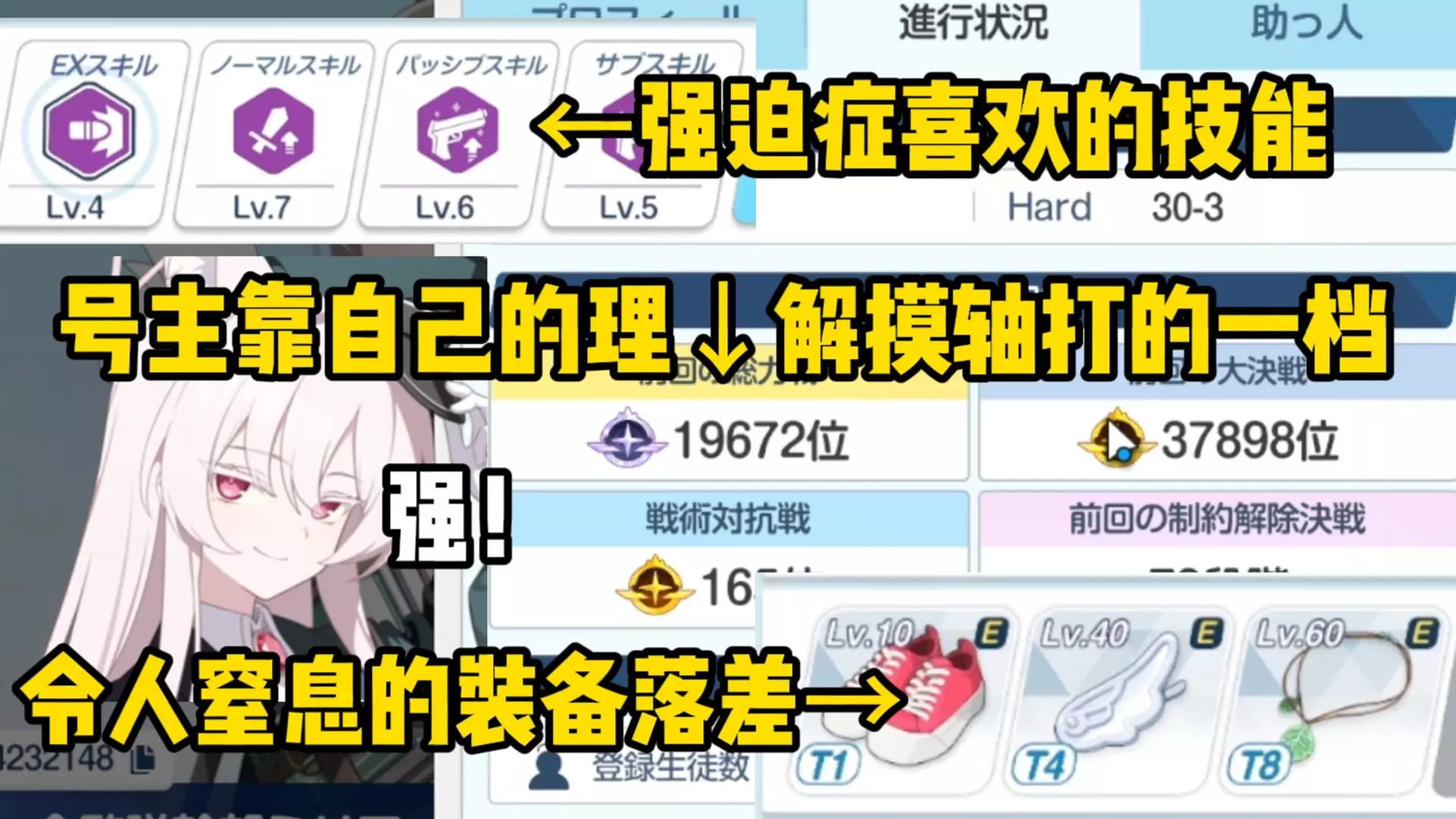这是蔚蓝档案的BA看号直播内容,主播帮粉丝查看账号账号练度与竞技场战况,分析账号当前配置,探讨该账号能否拿到总力战一档名次,展示了账号学生角色的属性技能与对战记录。