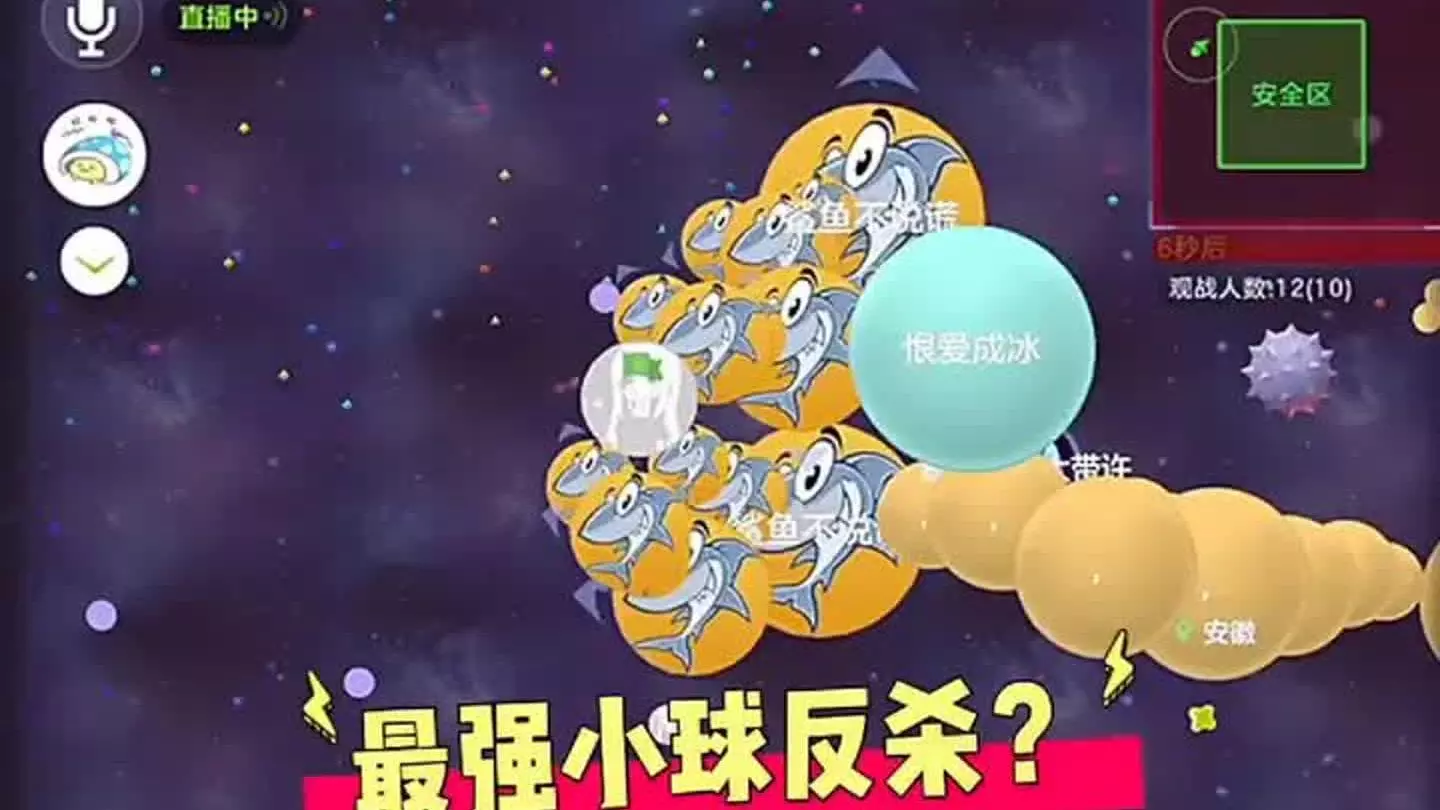 这是《球球大作战》的直播对战内容,展示了玩家“发狂迷”在对局中的精彩操作,完成了极限反杀,过程中呈现了游戏中的分裂、躲避尖刺等玩法,还有安全区收缩等对局机制。
