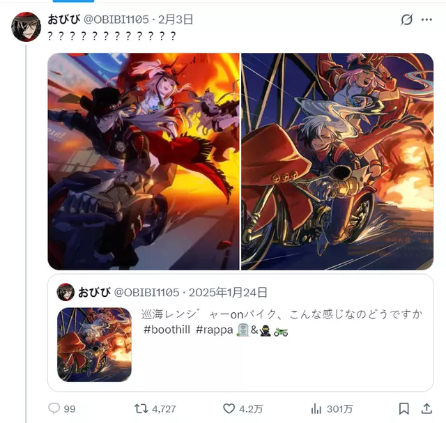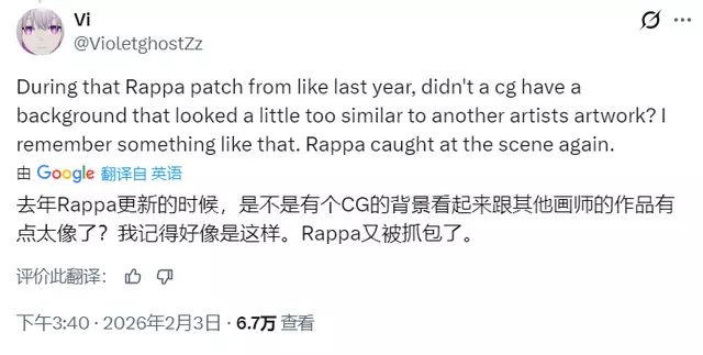 有一位日本画师在 X(原推特)上发帖表示:2026年2月3号的PV 里有一个镜头,跟他在2025年 1月24号发在X上的一张二创图“有点相似”。