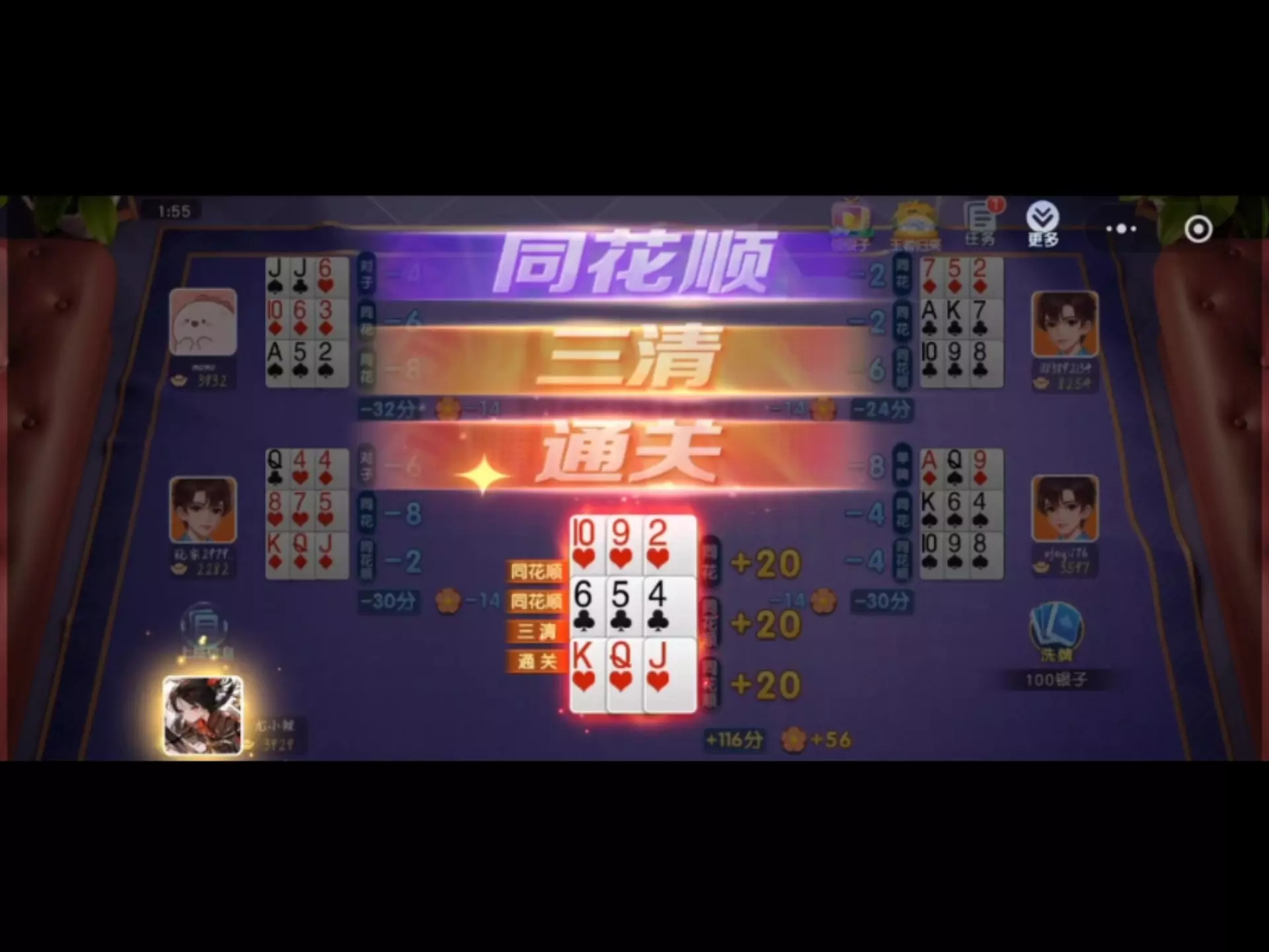 这是同城游比鸡的对局分享,展示了玩家即便没有三条牌型,依靠顺子、同花顺等牌型完成通关的过程,呈现了多局里的牌型搭配、得分情况,体现比鸡游戏的牌型策略玩法。
