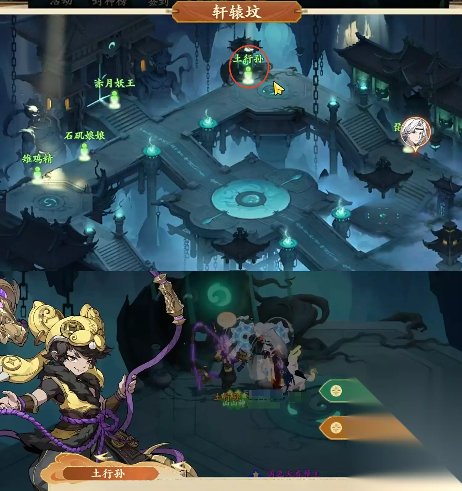 土行孙则是在另一张地图上,位于轩辕坟的右上角,赤月妖王的右边,如图中红色圈圈标注的地方。