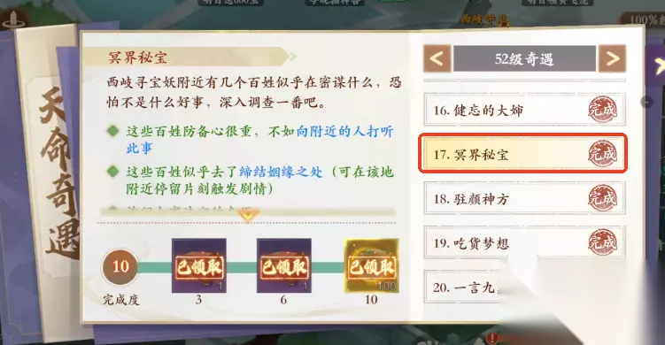 如图所示,到找回商人附近与一位西岐百姓交谈,领取这个“冥界秘宝”的奇遇任务,有的玩家接了这个任务后不知道如何进行下一步,其实还需要与另一个西岐百姓交谈。