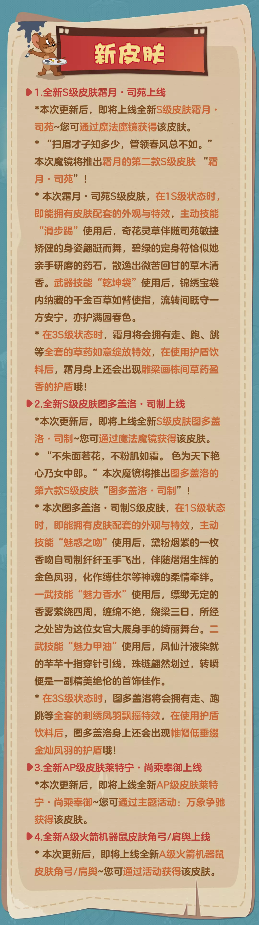 *本次更新后,即将上线全新S级皮肤霜月·司苑~您可通过魔法魔镜获得该皮肤。