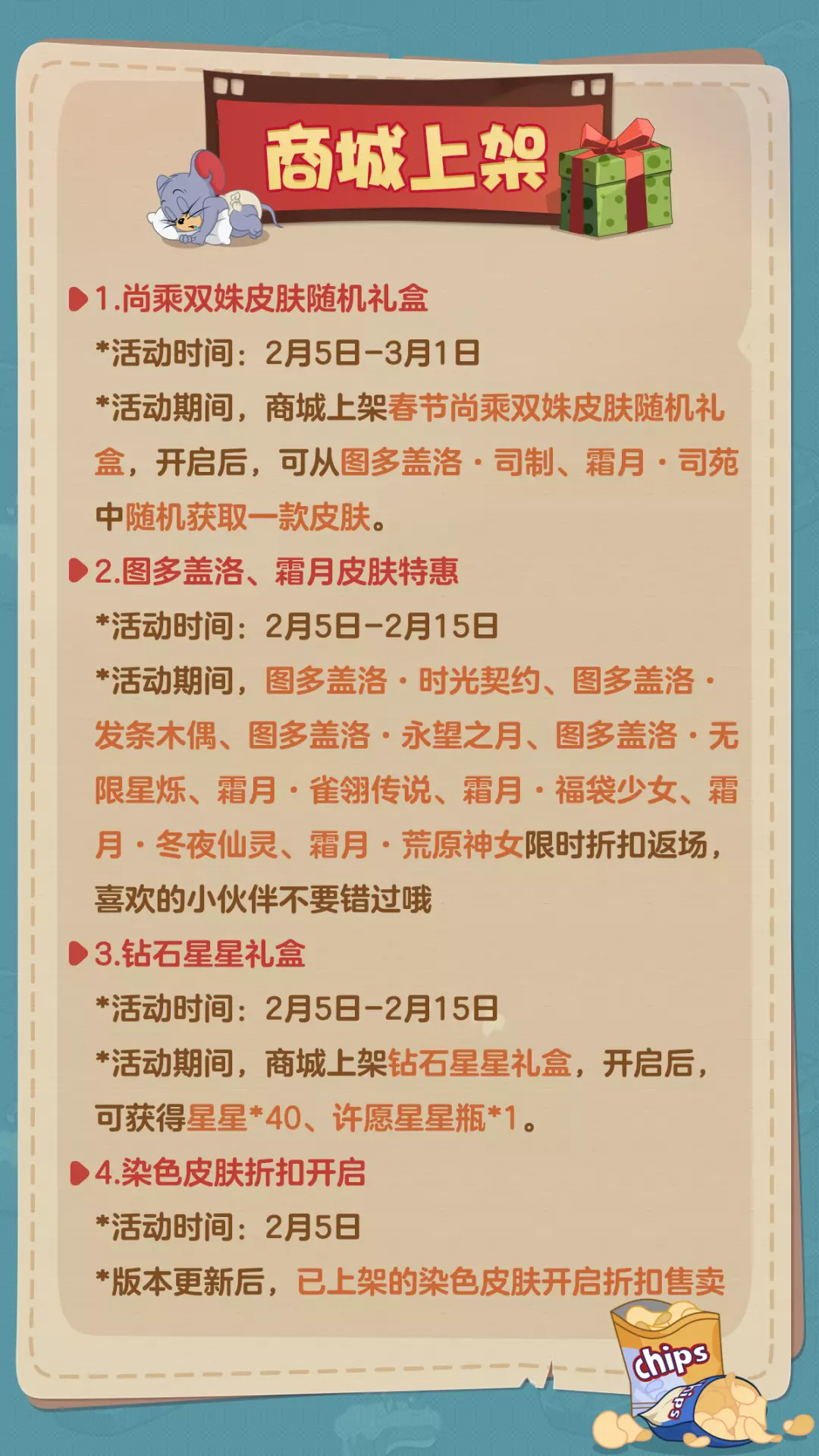 *活动期间,商城上架春节尚乘双姝皮肤随机礼盒,开启后,可从图多盖洛·司制、霜月·司苑中随机获取一款皮肤。