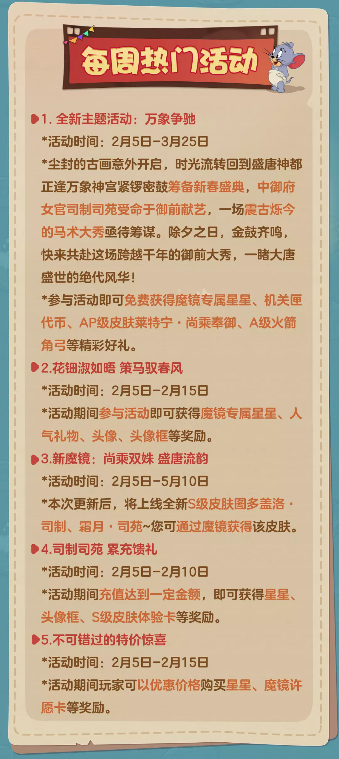 以上就是本周(2月5日)更新维护的全部内容啦!感谢小伙伴们对于《猫和老鼠》手游的支持和喜爱,愿欢乐永远陪伴大家左右!