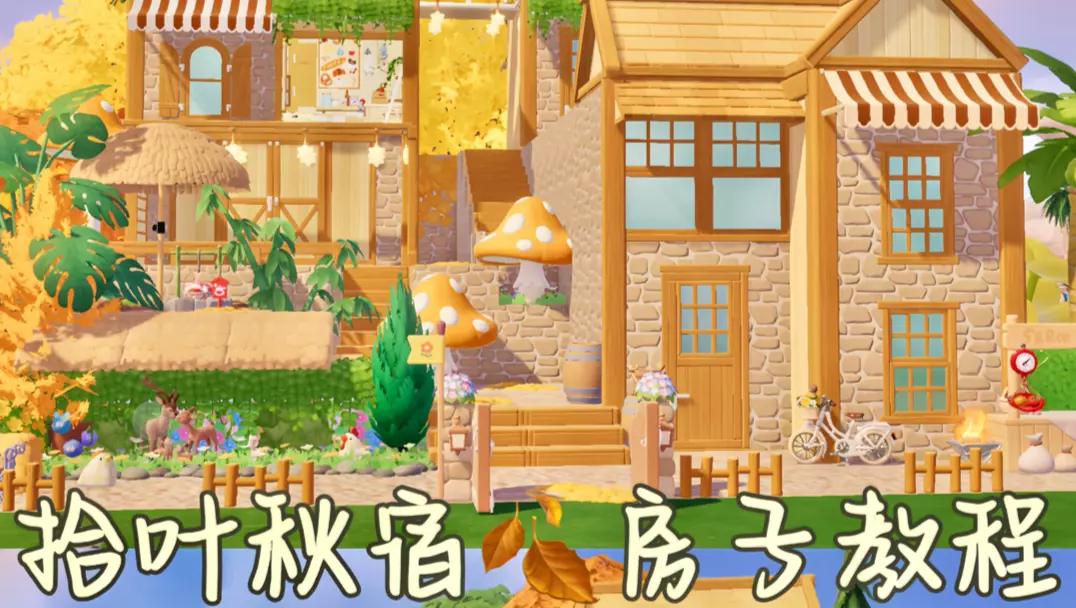 这是模拟经营游戏《心动小镇》的秋系列「拾叶秋宿」建造展示,呈现了充满秋日氛围的田园小屋与庭院,有秋日植被、可爱动物装饰,还有角色互动场景,尽显治愈的秋日田园风格。