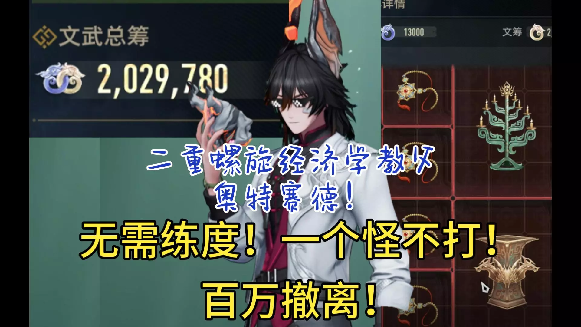 稳定百万撤离攻略:搜的收益比打高,但是打是必须要进行的,不然游戏内的一些奖励机制无法进行。先杀怪凑武筹,然后去供奉,刷结算香炉,目前刷到过最好的是带出3紫文筹奖励*2.5,然后去开房卡找大红即可。 背包塞满红,就算全是小红,也有40w左右,然后通过香炉的结算2.5倍,就可以百万撤离了。一般一局6-8分钟即可,下雨不用去打boss,奖励不高。 小技巧:右键物品可以快捷转移 推荐角色:玉米>苏乙≥赛琪≥黎瑟。