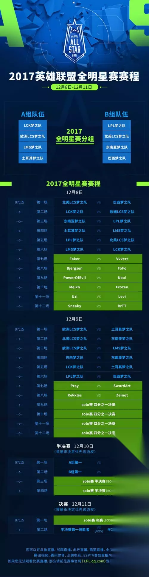 2017英雄联盟全明星赛于12月8日-11日举办,文中及图中公布了详细赛程、分组,还介绍了斗鱼、战旗等直播渠道,错过直播可去赛事官网看录像,想观赛的玩家可按赛程安排通过对应渠道观看。