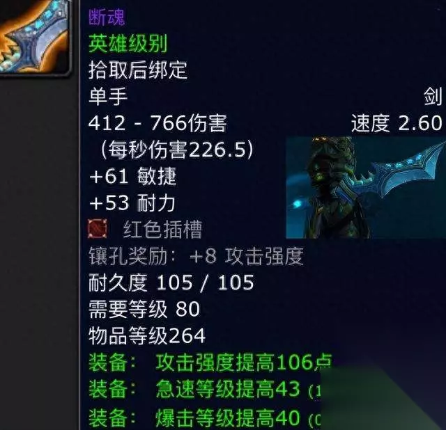第五件:断魂。这是一把物理极品单手剑,我们还是先来看看它的属性,它是2.6的攻速配合着226.5的秒伤,说实话秒伤有点低,但是不妨碍它其他的属性的优势,它的白字属性是61点高额的敏捷和53点的耐力,小鹿就喜欢主属性要比耐力高的装备,并且还给到了一个红色宝石孔,红孔永远都是DPS最好的颜色,绿字属性则是106点的攻强和43点的急速以及40点的暴击,我猜想剑贼应该不会放过这把武器吧,如果要是装等在高一个档次,这完全就是一把毕业武器。
