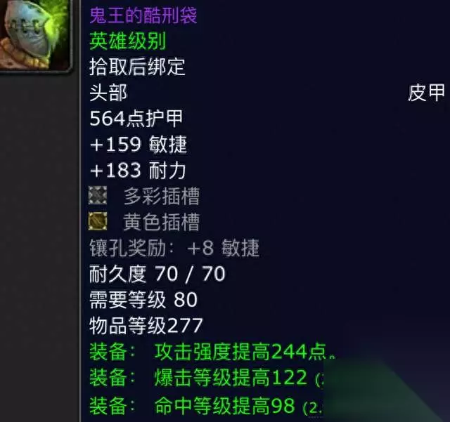 第六件:鬼王的酷刑袋。这是一件物理皮甲头盔,我们先来看看它的属性,它的白字属性都是杵到顶的数值,有着159点的敏捷和183的耐力,然后它的宝石孔也是非常的极品,一个多彩和一个黄色加持,绿字属性则是244点的攻强和122点超额暴击以及98点的高命中,这属性绝对是刺杀贼的极品,虽然平时我们都说命中装备在后期不吃香,确实也是,但是这件装备可以说是一匹黑马,也就是说我们必须要给这件装备留一个空位,用它来补命中。