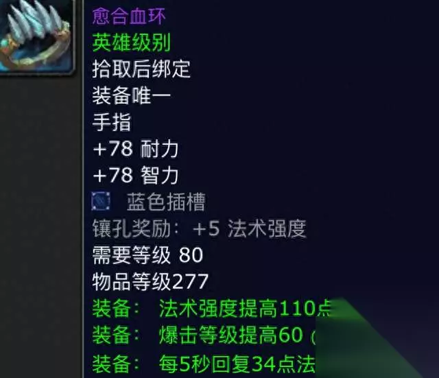 第八件:愈合血环。这是一枚法系回蓝戒指,我们先来看看它的属性,它的白字属性是78点的耐力和智力,随后给到了一个蓝色宝石孔,绿字属性则是110点的法强和60点的暴击以及5回34点蓝量,虽然这件装备的属性中规中矩,没有什么特别的地方,但是在奥法和治疗有续航问题的时候,这枚戒指可以说是雪中送炭。